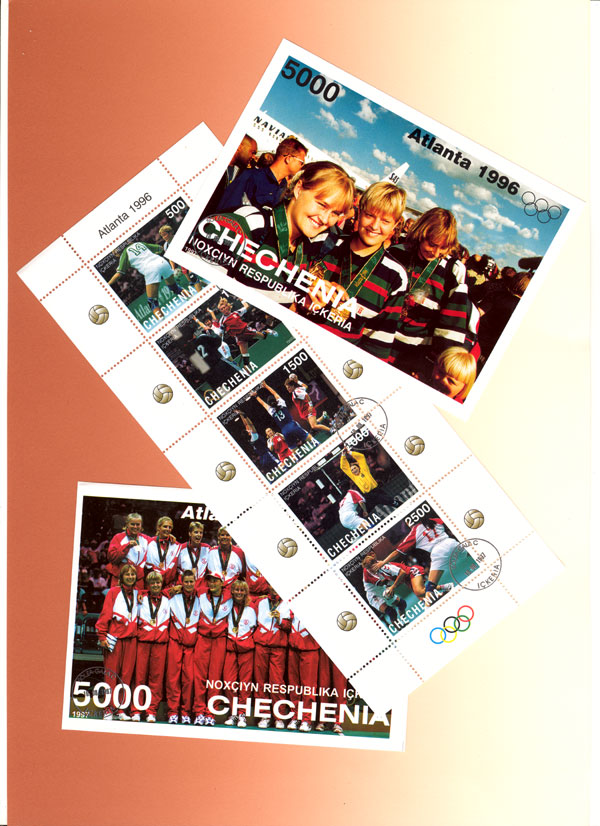 Men det ka' nok være at mine pupiller gik på udvidelsesturne, for det var intet mindre end guldpigerne, der tonede frem fra plastikposerne. Susanne Munk Lauritsen, Anja Andersen, Tonje Kjærsgaard og alle de andre fra det hold, der erobrede guldmedaljer ved De Olympiske Lege i Atlanta i 1996 ... her var de ... på frimærker fra Tjetjenien!